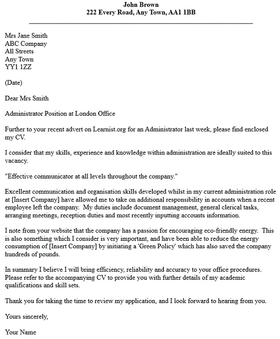 Admin Cover Letter Examples